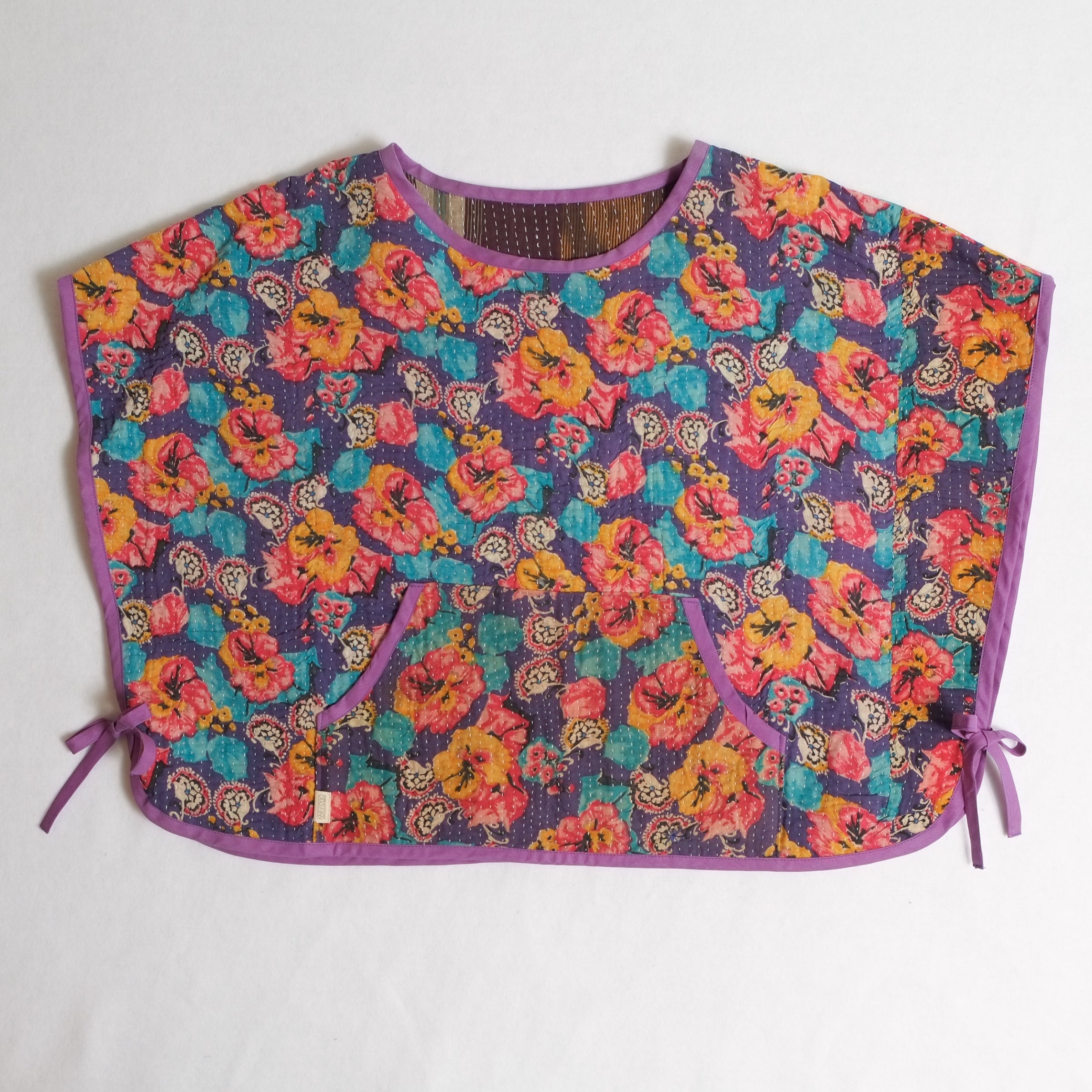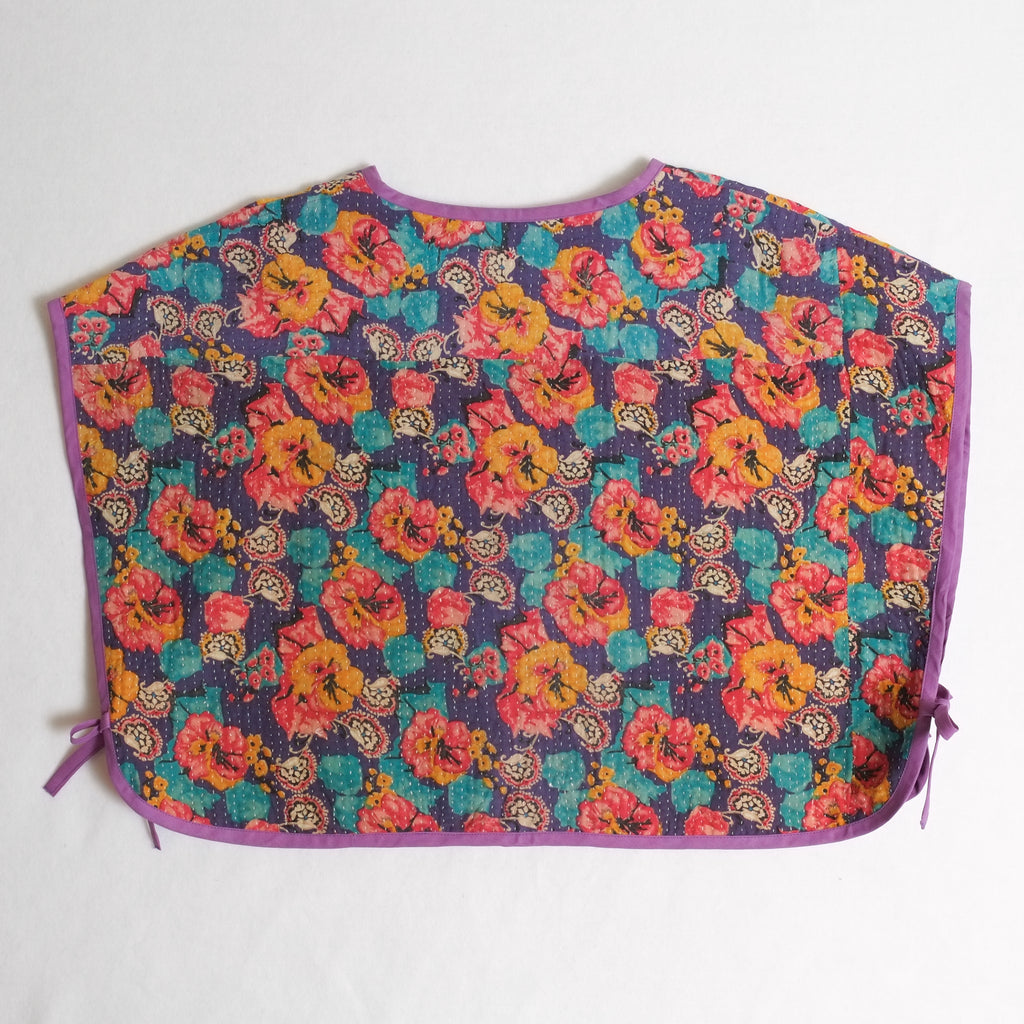 Mary Smock L008 Red and Yellow Flowers on Purple – Reversible Kantha Poncho, Handmade Sustainable Clothing