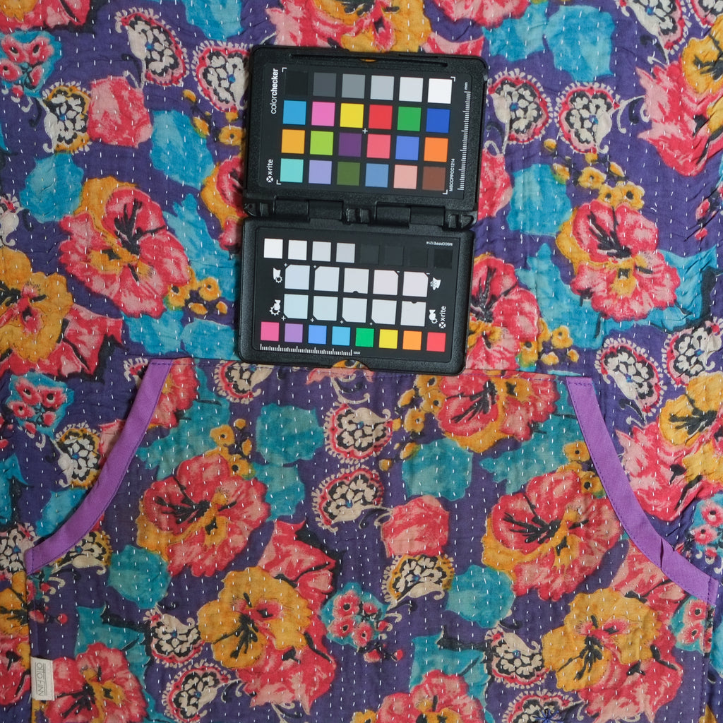 Made from vintage kanthas and bound with cotton bias tape, the Mary Smock is designed for ventilated warmth, color, and ease. It slips overhead, ties at both sides of the body, and reverses for versatile wear. A roomy kangaroo pocket adds both comfort and practicality, making it a vibrant, functional layer for year-round styling.