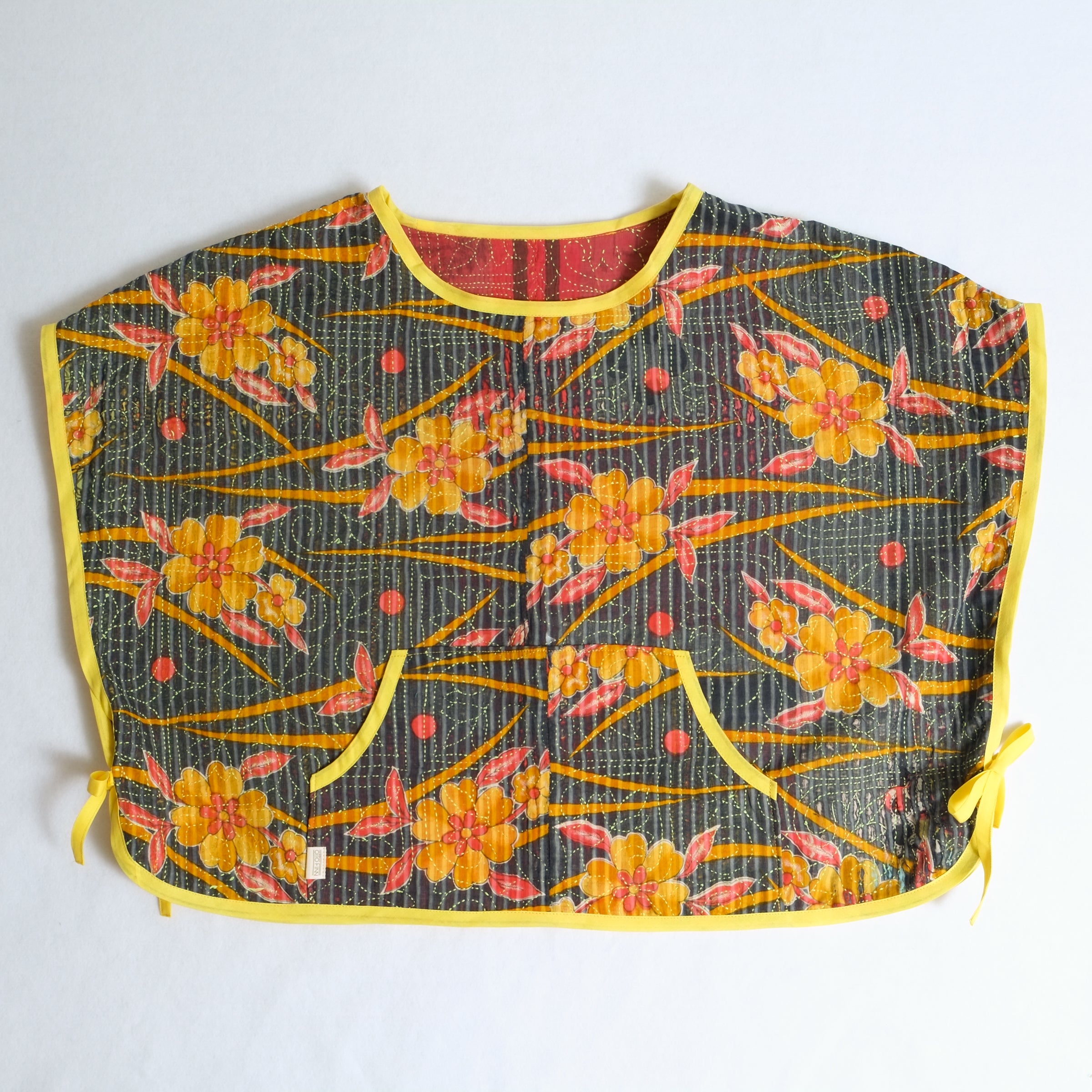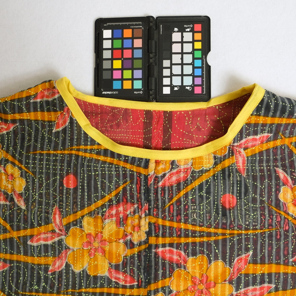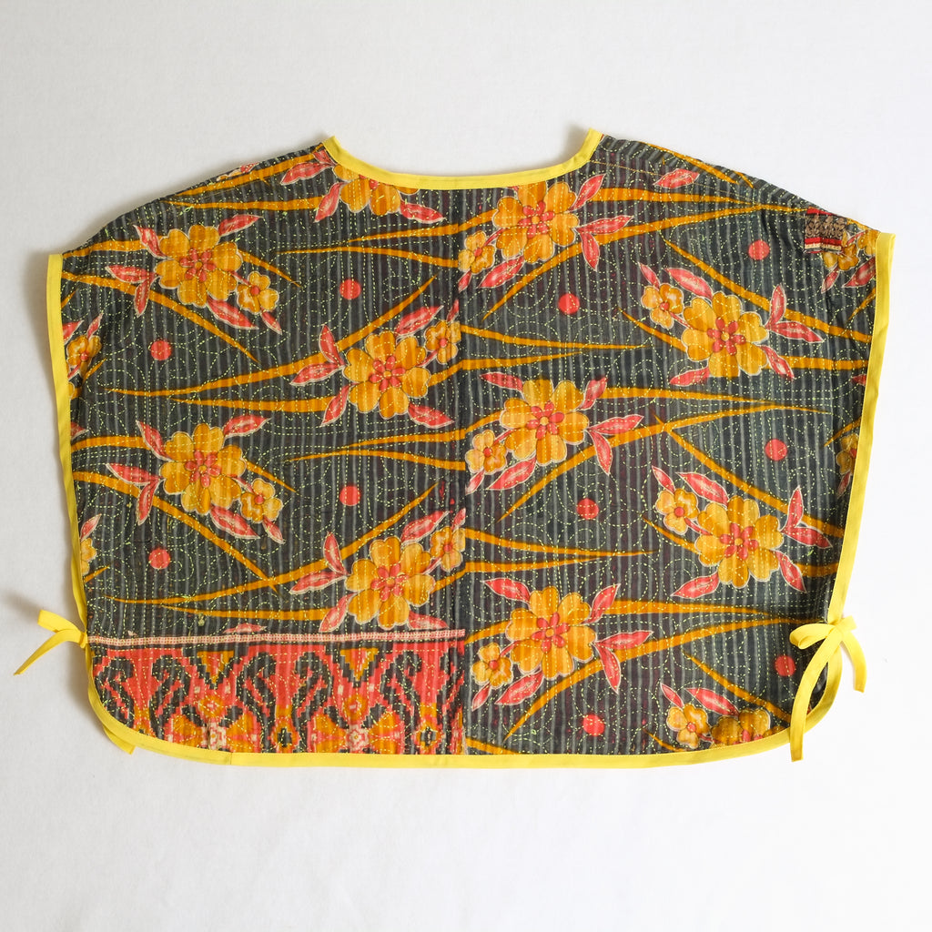 Mary Smock XL016 Yellow Flowers on Black – Reversible Kantha Poncho, Handmade Sustainable Clothing