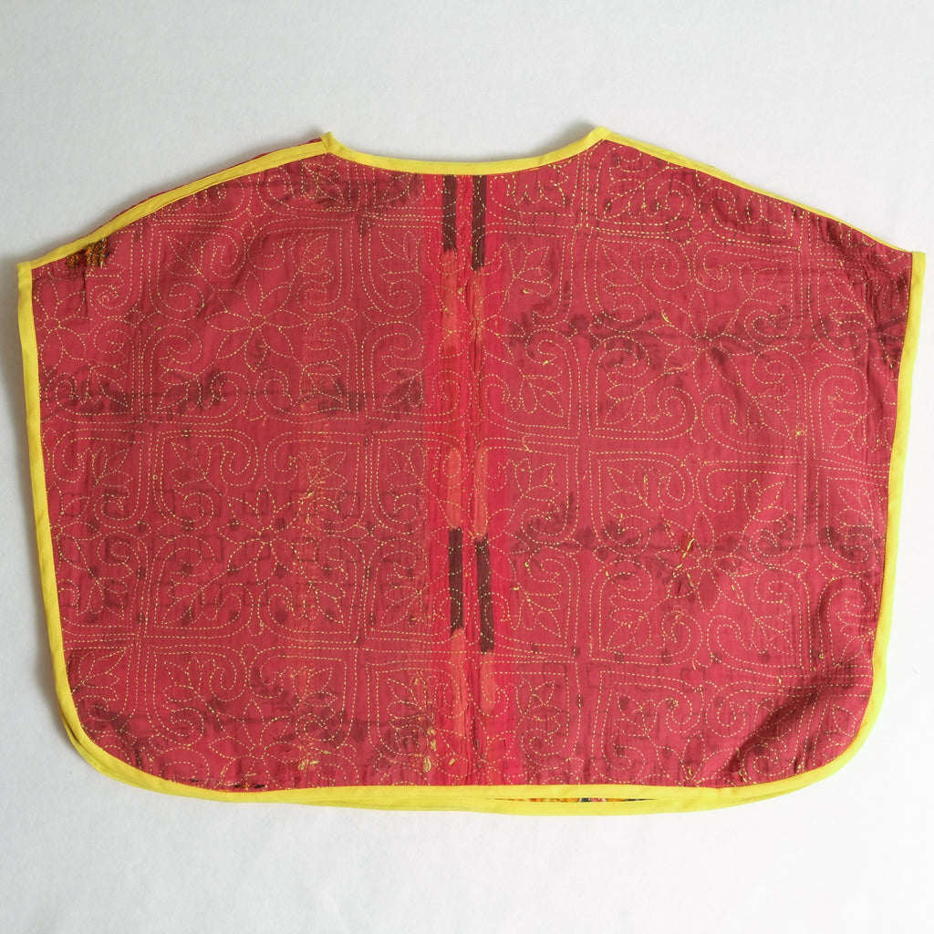 Made from vintage kanthas and bound with cotton bias tape, the Mary Smock is designed for ventilated warmth, color, and ease. It slips overhead, ties at both sides of the body, and reverses for versatile wear. A roomy kangaroo pocket adds both comfort and practicality, making it a vibrant, functional layer for year-round styling.