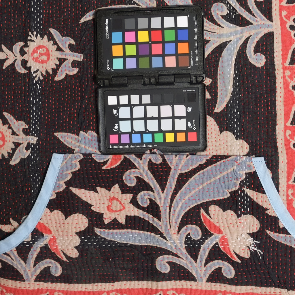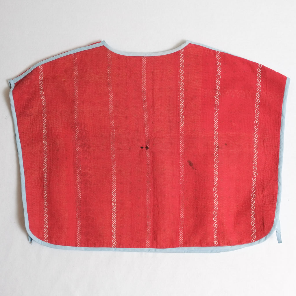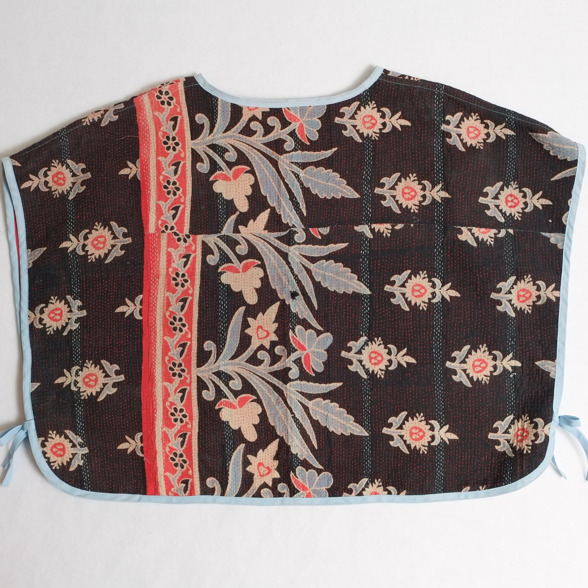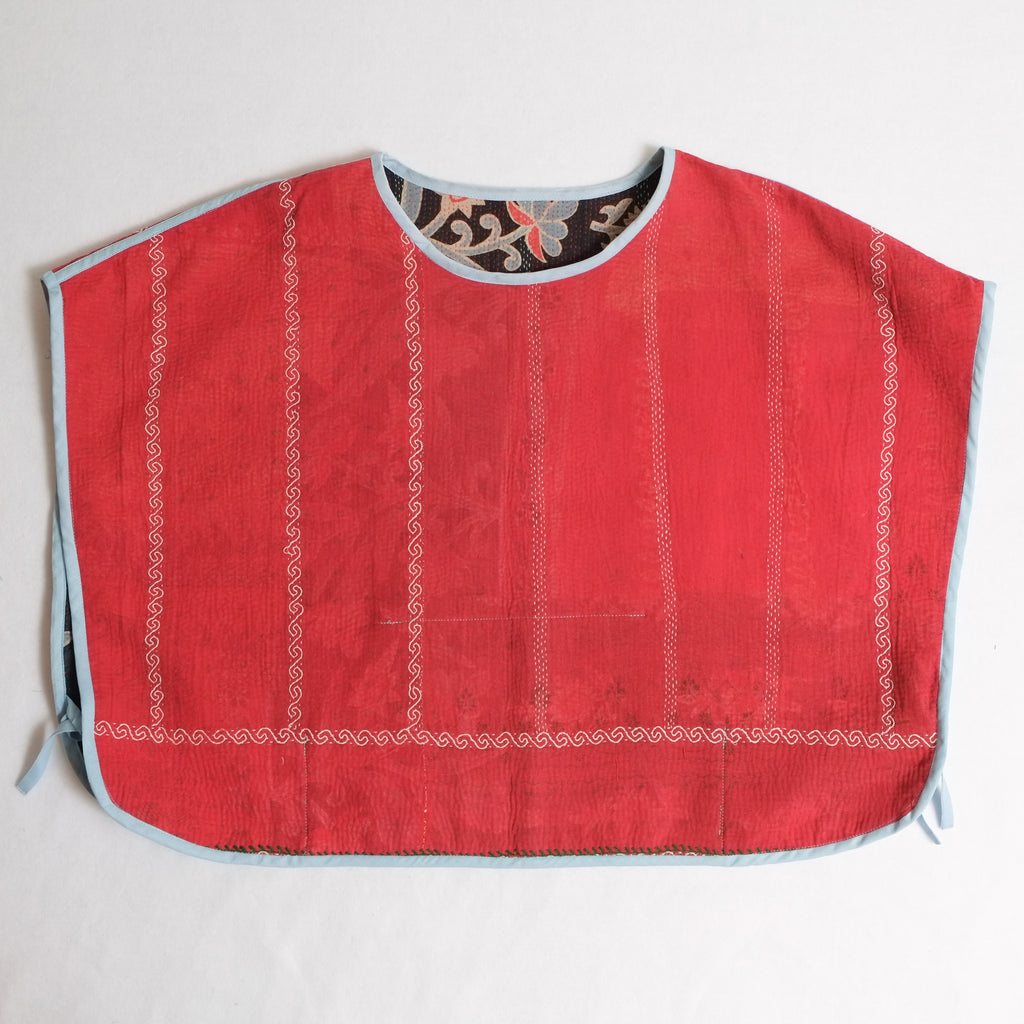 Made from vintage kanthas and bound with cotton bias tape, the Mary Smock is designed for ventilated warmth, color, and ease. It slips overhead, ties at both sides of the body, and reverses for versatile wear. A roomy kangaroo pocket adds both comfort and practicality, making it a vibrant, functional layer for year-round styling.