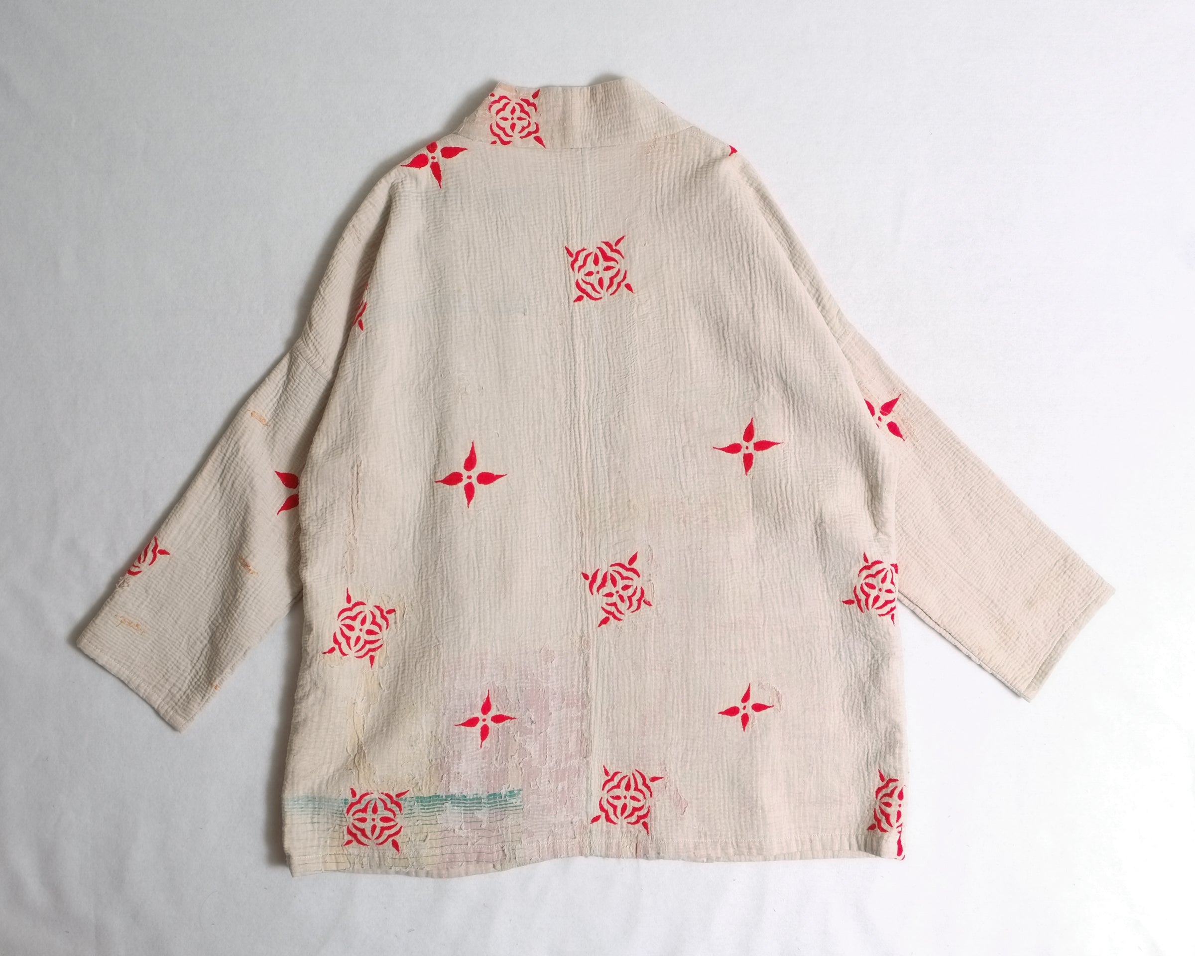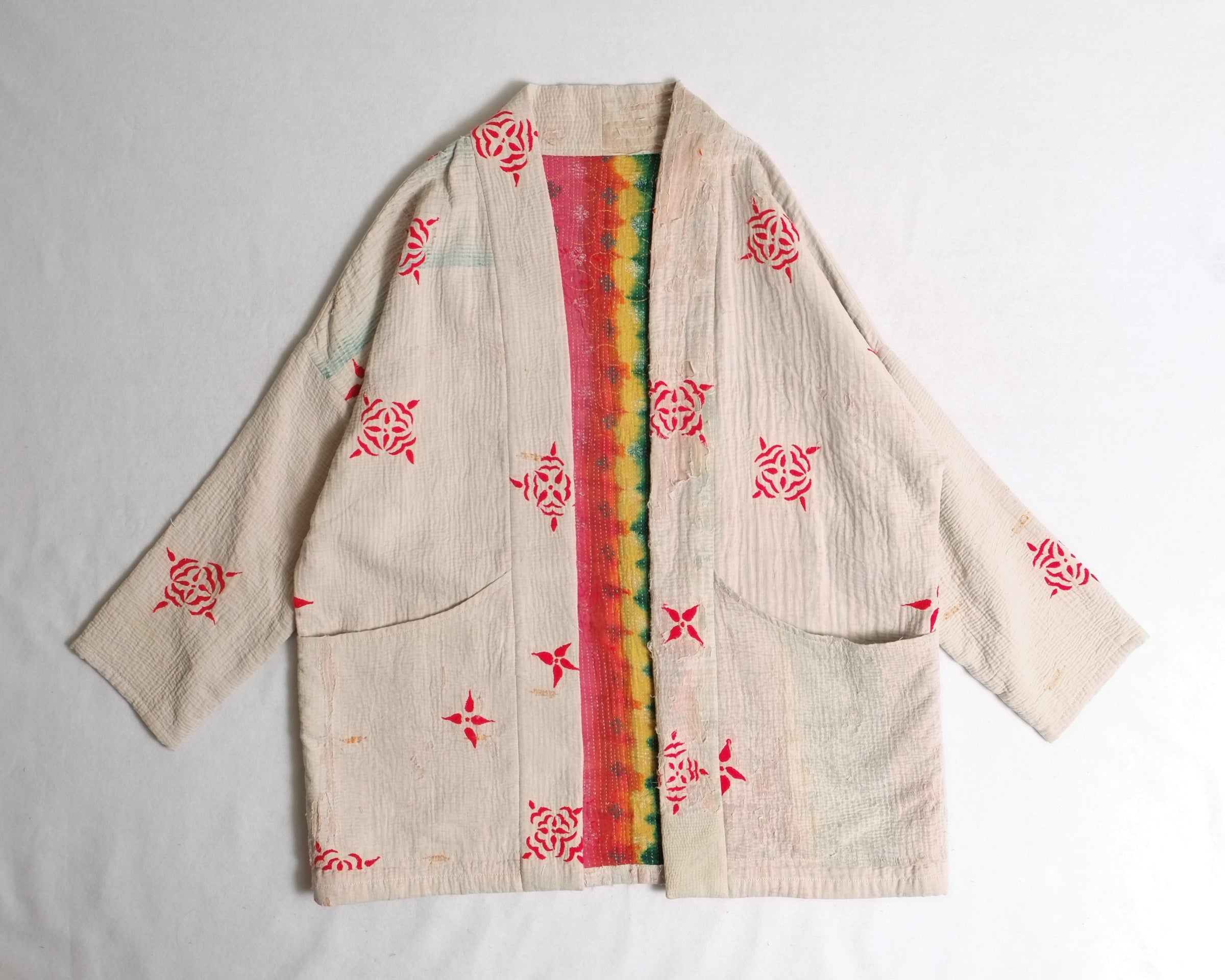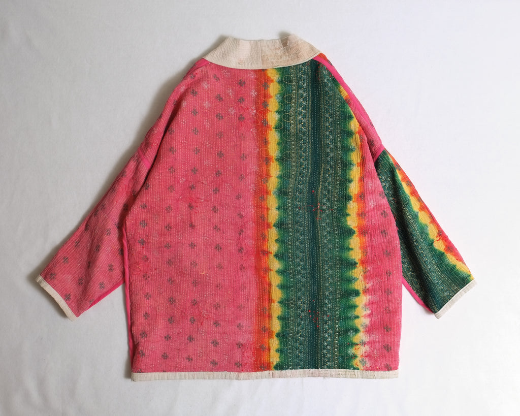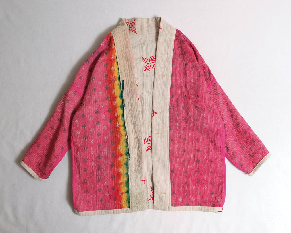 Made from traditional Bengali Kantha quilts, repurposed from vintage saris and fabrics, each Anoushka Jacket is a unique, reversible creation designed for comfort and style. The oversized kimono silhouette, inspired by Asian street style, features large pockets for essentials like your phone, wallet, or snacks.