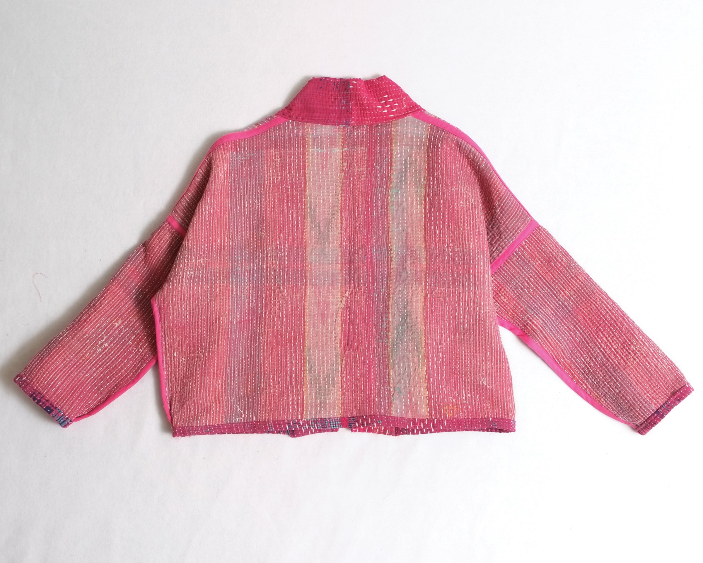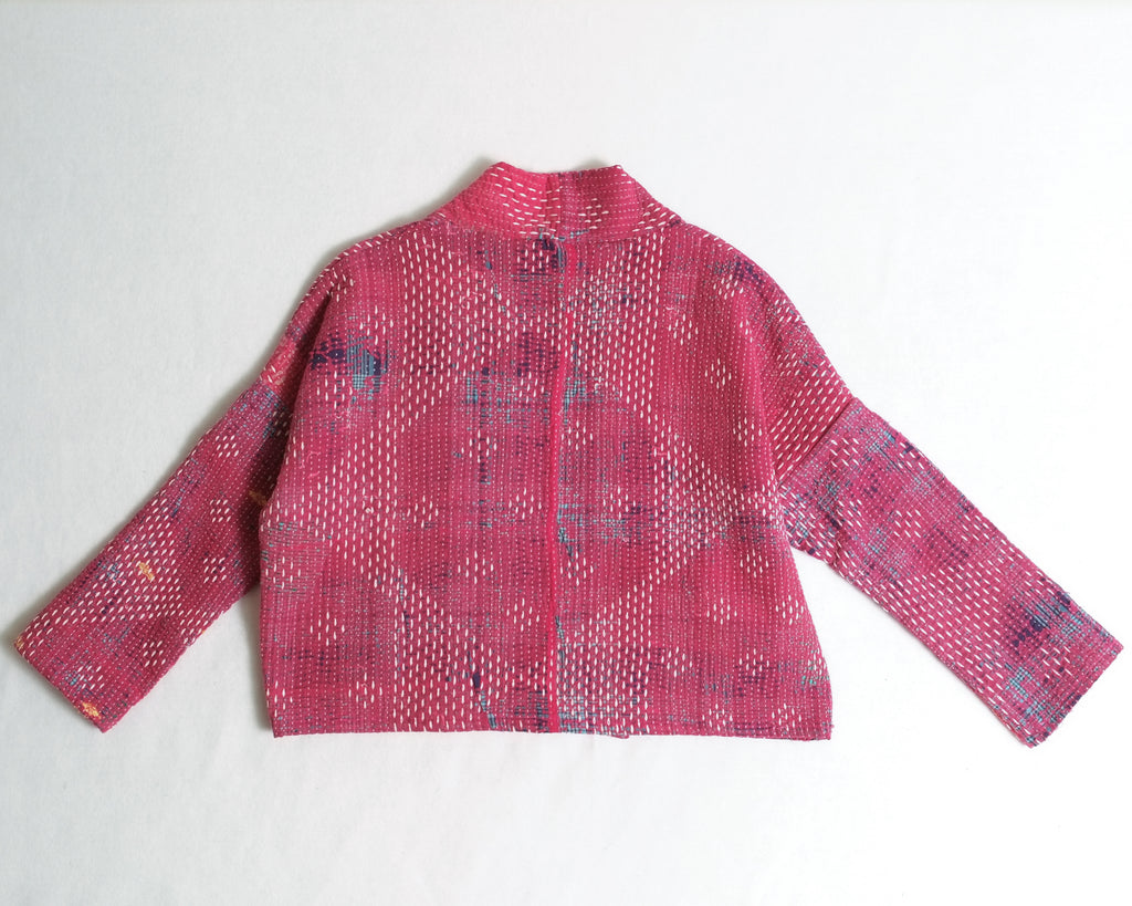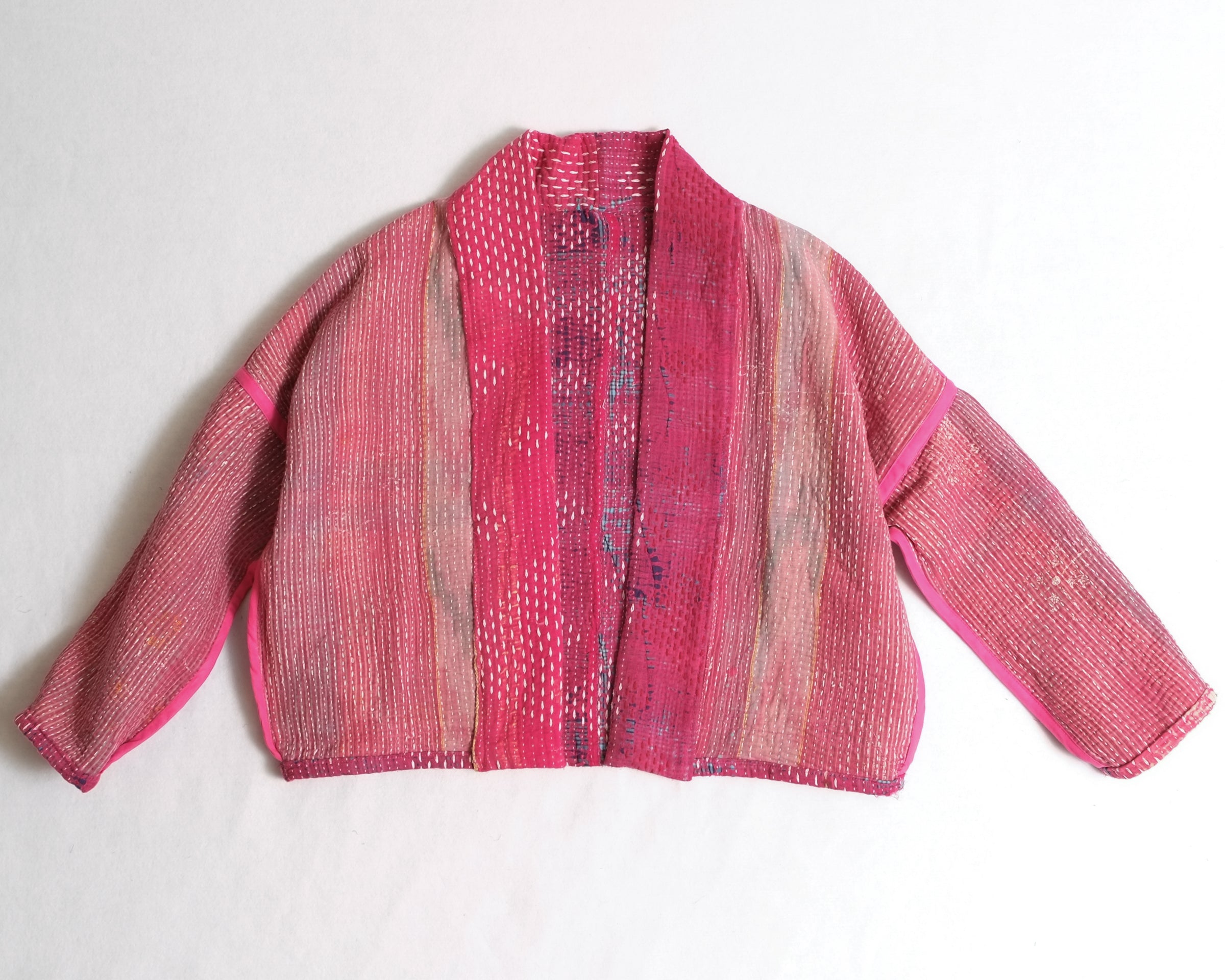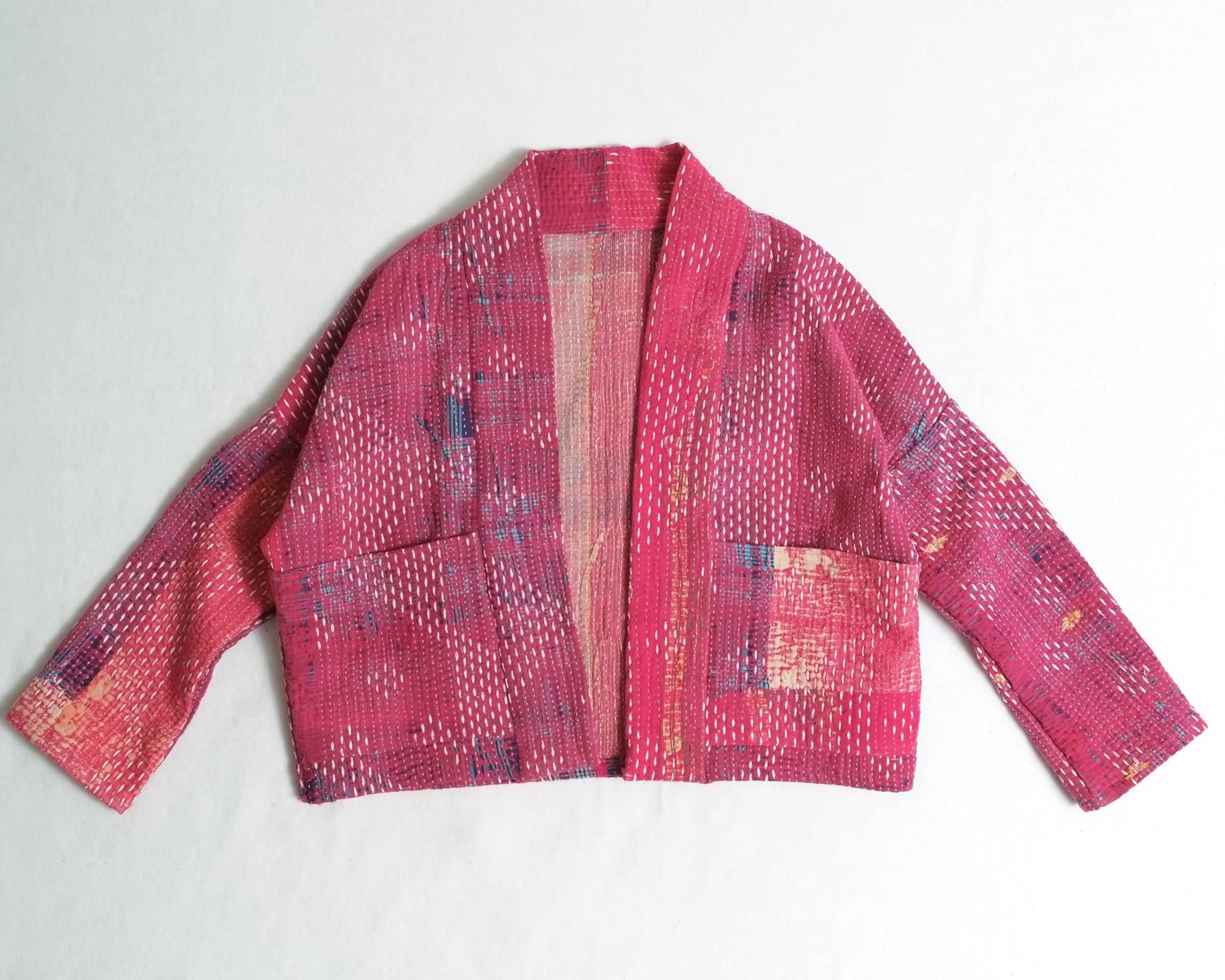 Made from traditional Bengali Kantha quilts, repurposed from vintage saris and fabrics, each Anoushka Jacket is a unique, reversible creation designed for comfort and style. The oversized kimono silhouette, inspired by Asian street style, features large pockets for essentials like your phone, wallet, or snacks.