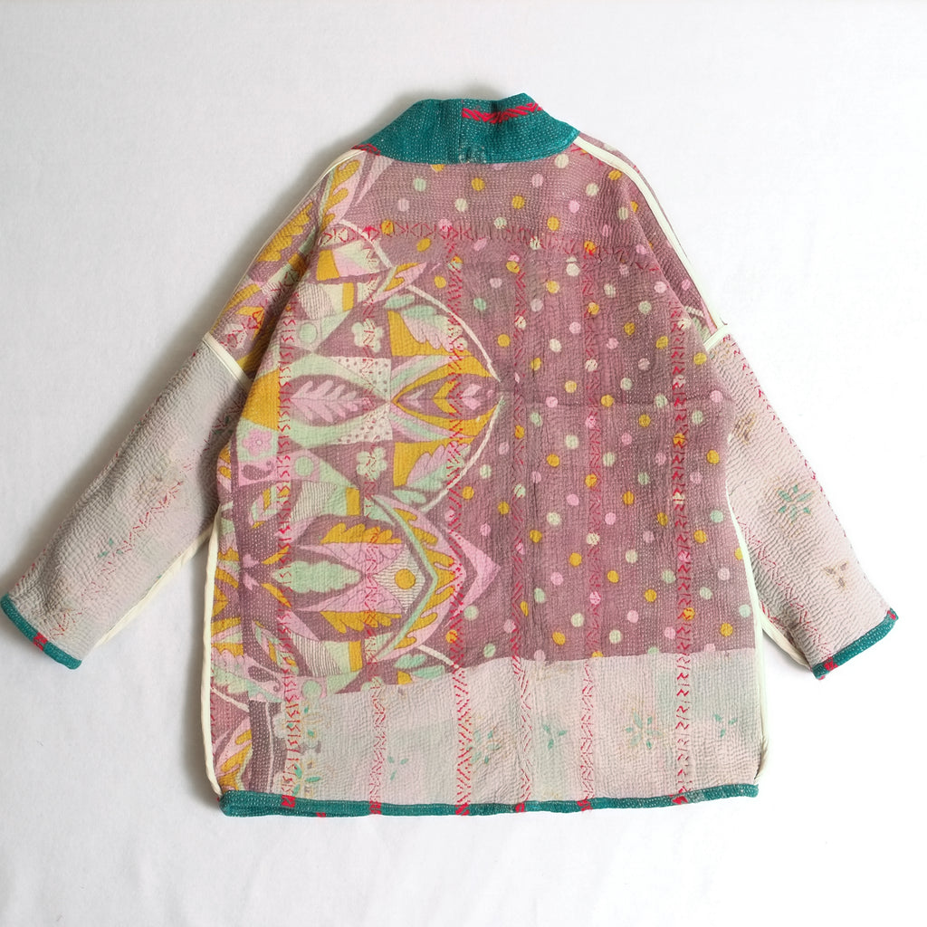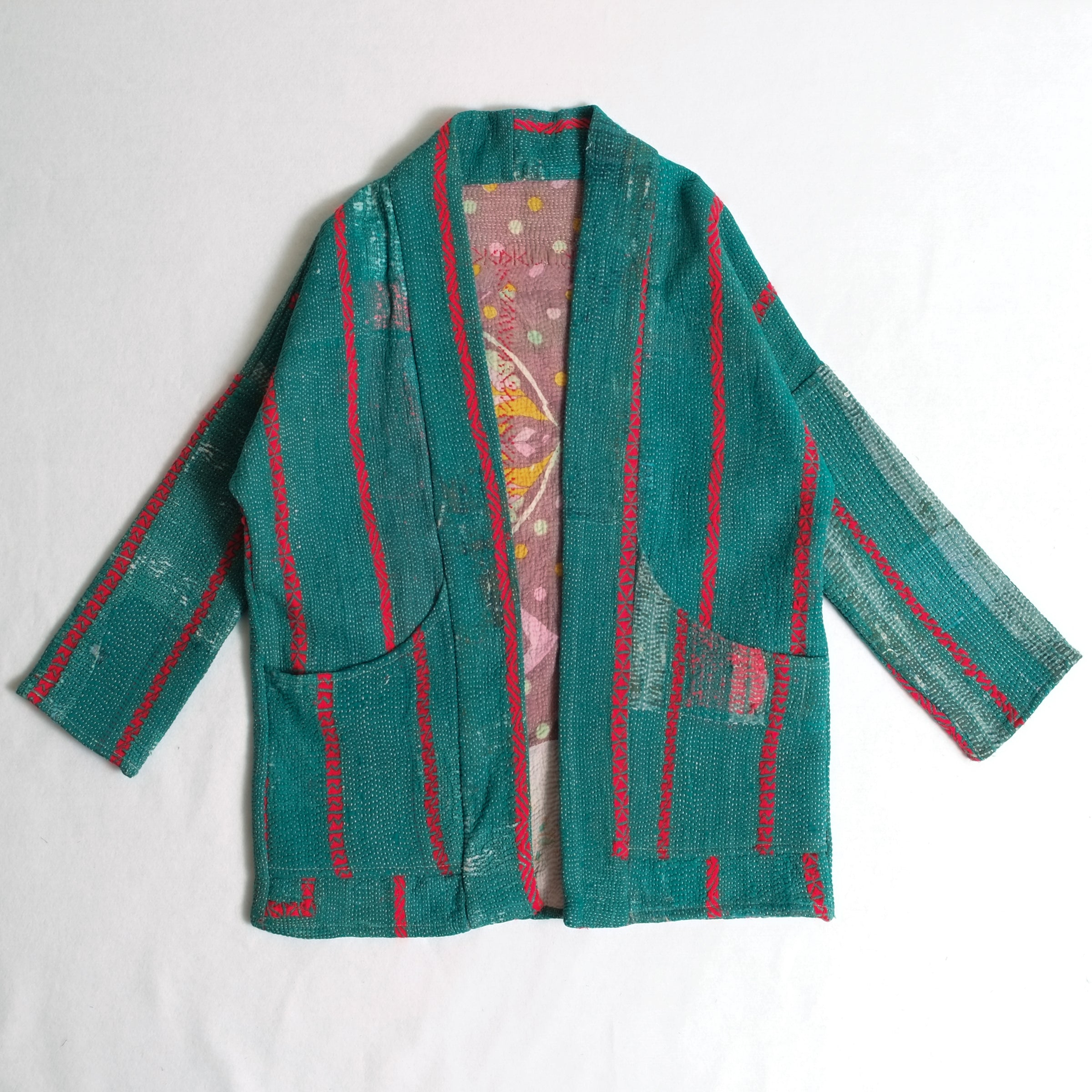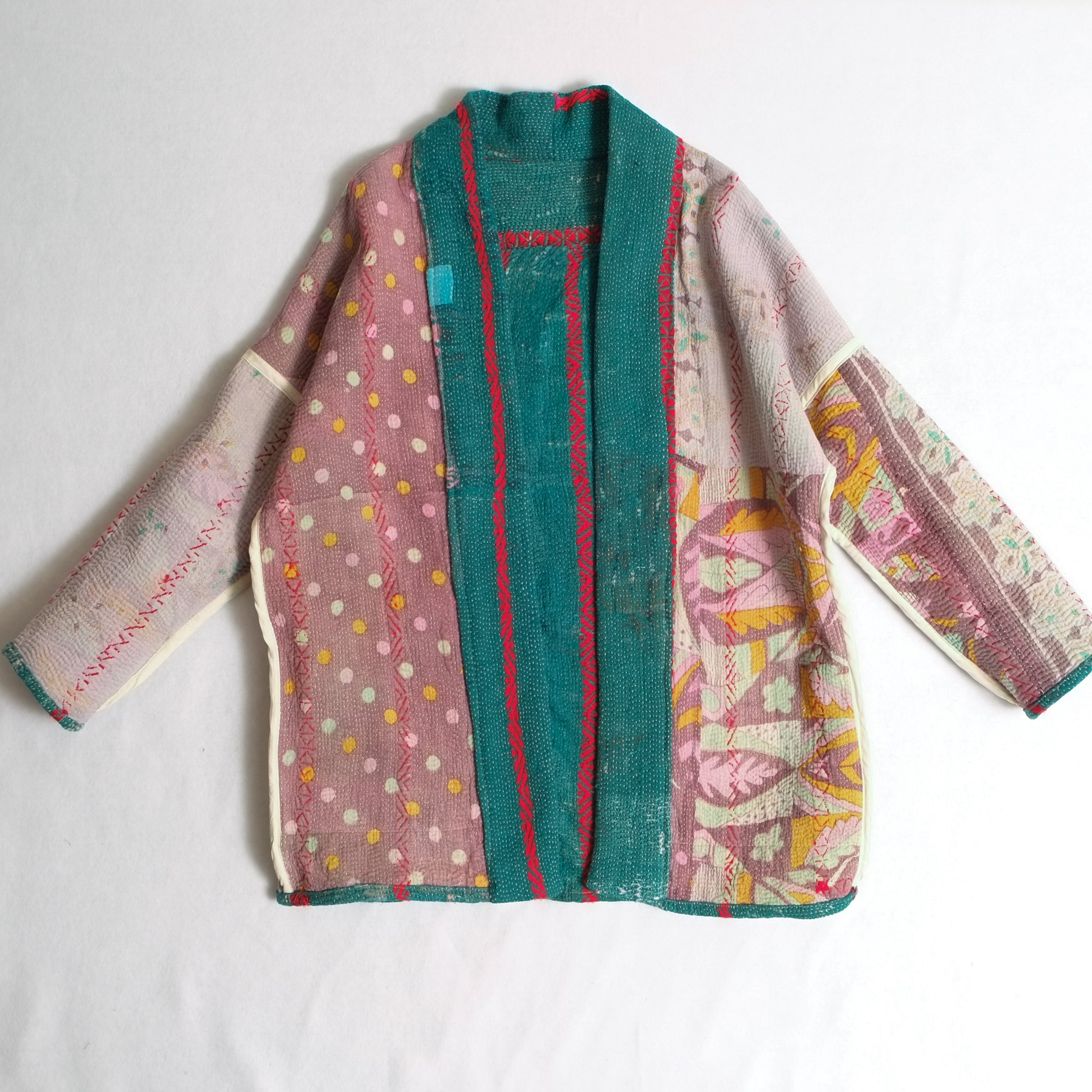 Made from traditional Bengali Kantha quilts, repurposed from vintage saris and fabrics, each Anoushka Jacket is a unique, reversible creation designed for comfort and style. The oversized kimono silhouette, inspired by Asian street style, features large pockets for essentials like your phone, wallet, or snacks.