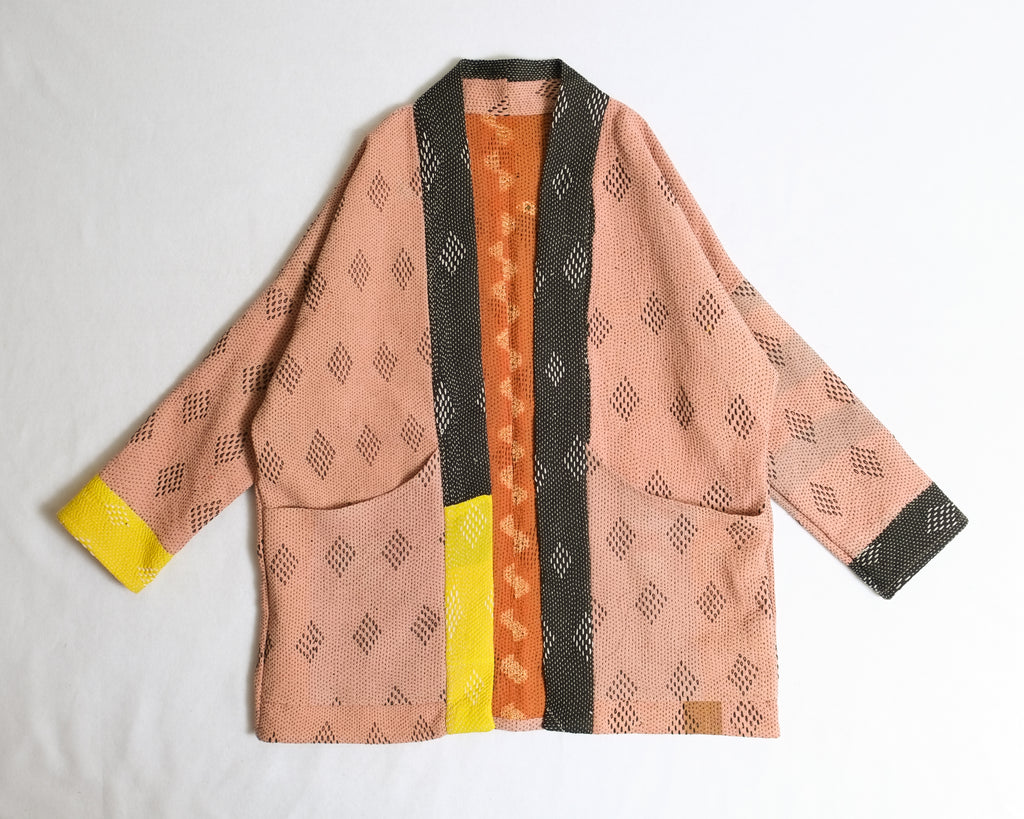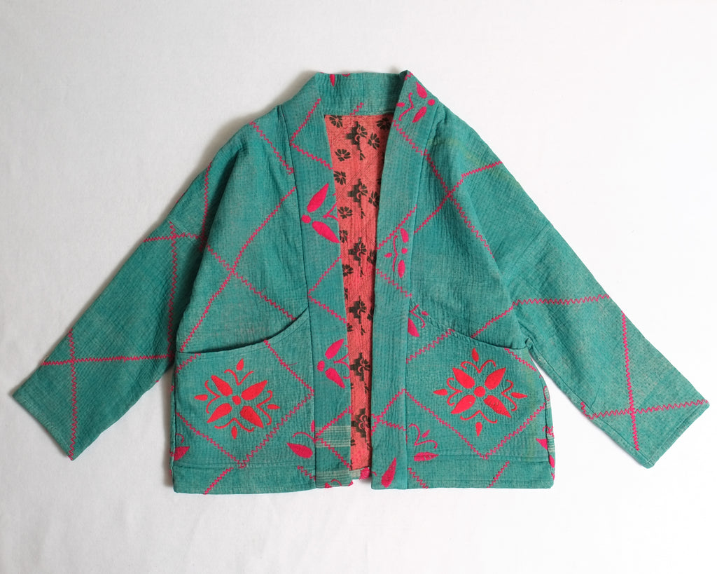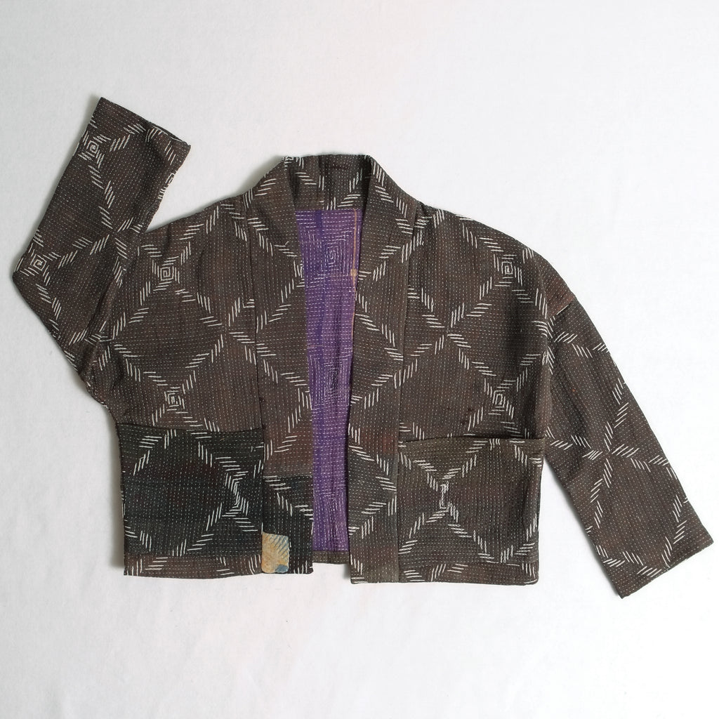 XXS Anoushka Jacket LS086 – Handmade Reversible Kantha Jacket – Grey with Diamond Lattice Embroidery