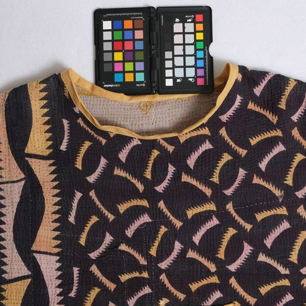 Made from vintage kanthas and bound with cotton bias tape, the Mary Smock is designed for ventilated warmth, color, and ease. It slips overhead, ties at both sides of the body, and reverses for versatile wear. A roomy kangaroo pocket adds both comfort and practicality, making it a vibrant, functional layer for year-round styling.