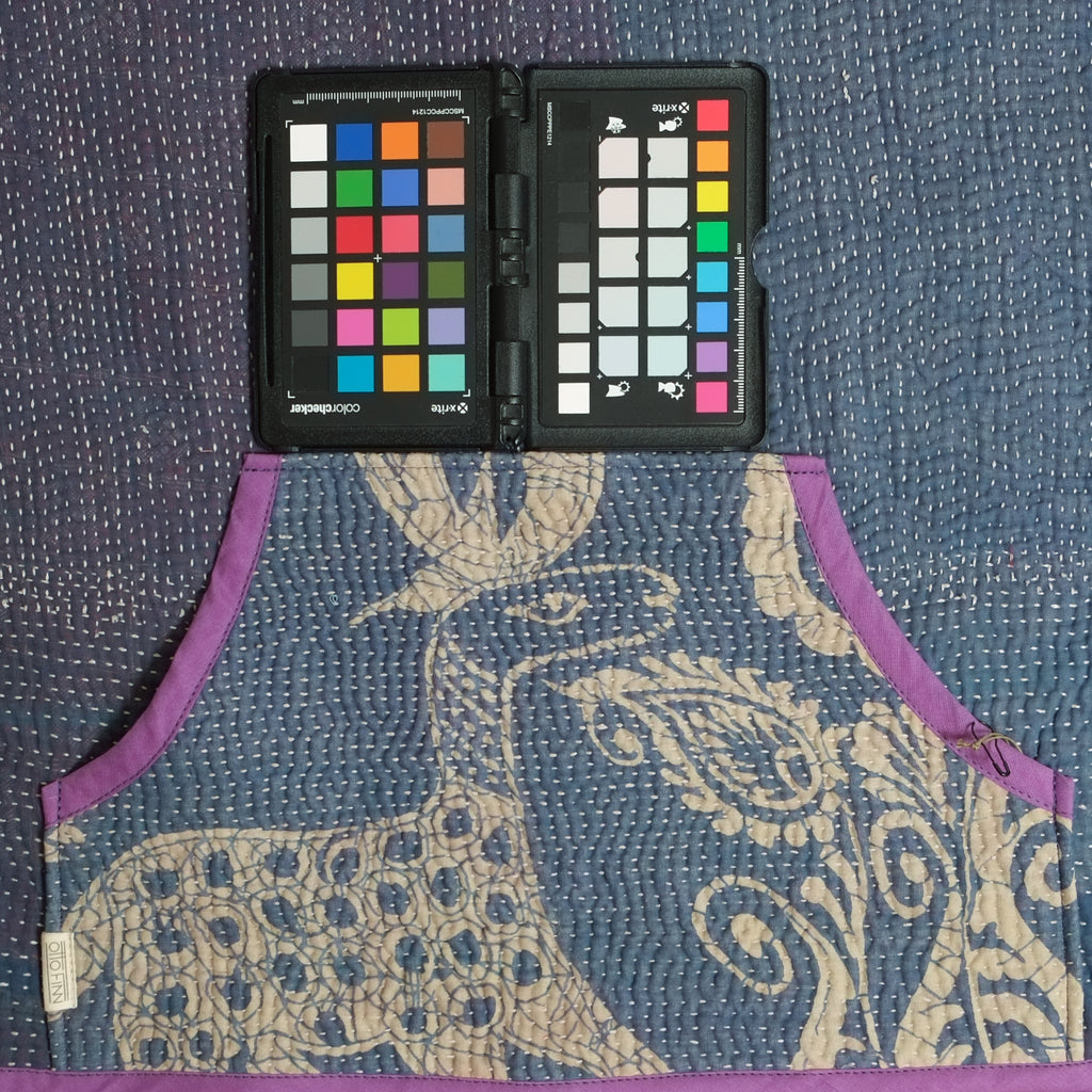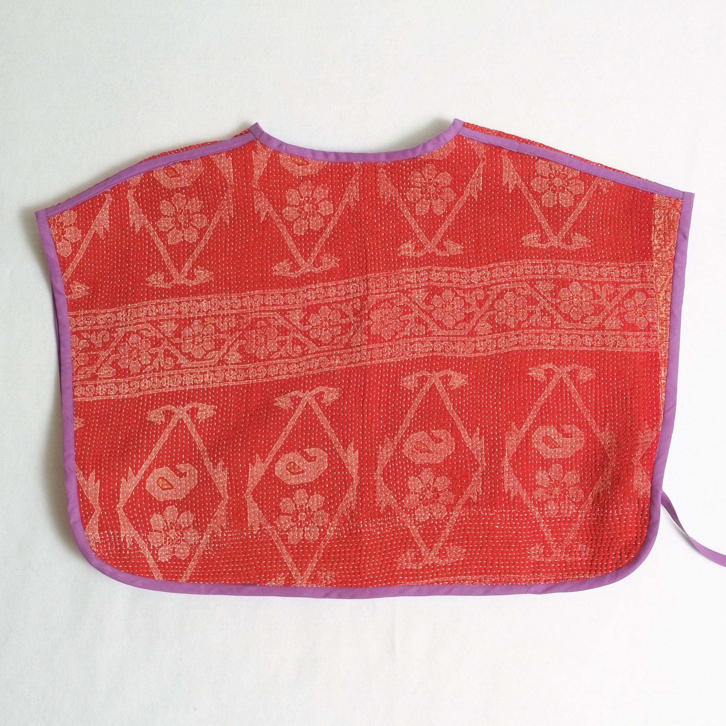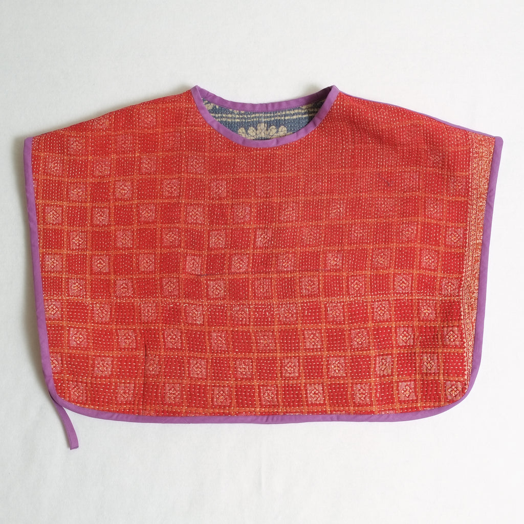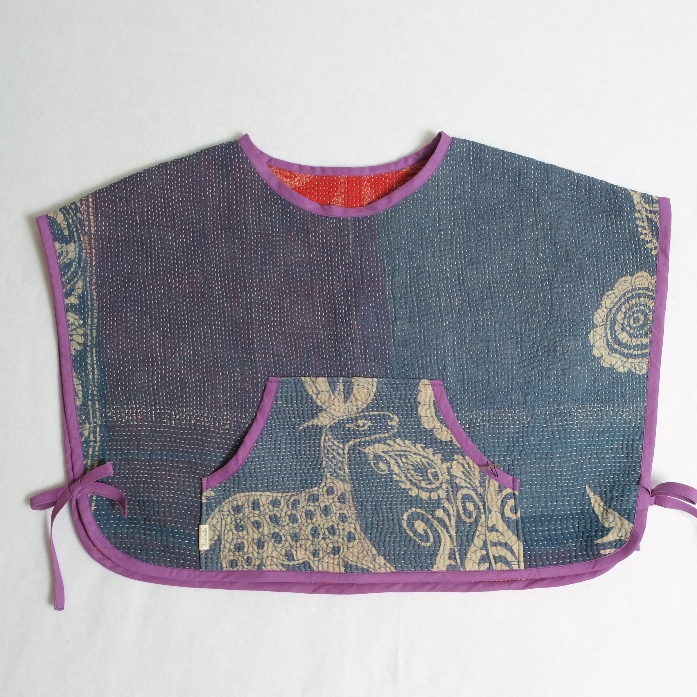 Made from vintage kanthas and bound with cotton bias tape, the Mary Smock is designed for ventilated warmth, color, and ease. It slips overhead, ties at both sides of the body, and reverses for versatile wear. A roomy kangaroo pocket adds both comfort and practicality, making it a vibrant, functional layer for year-round styling.