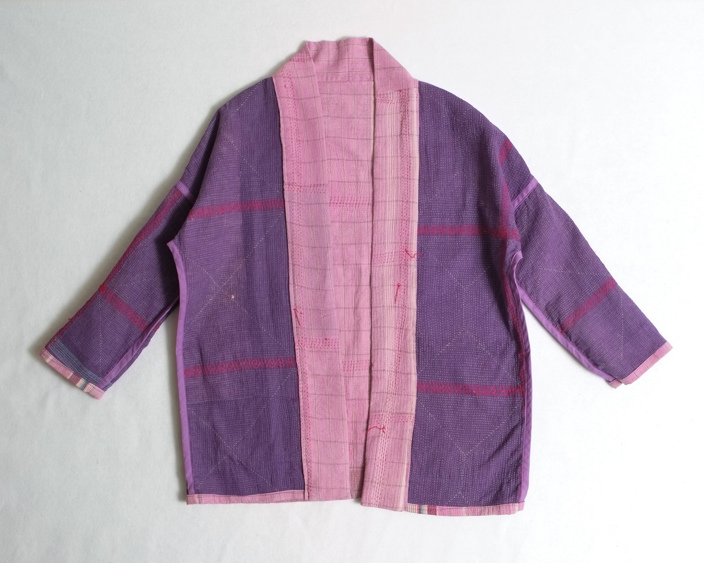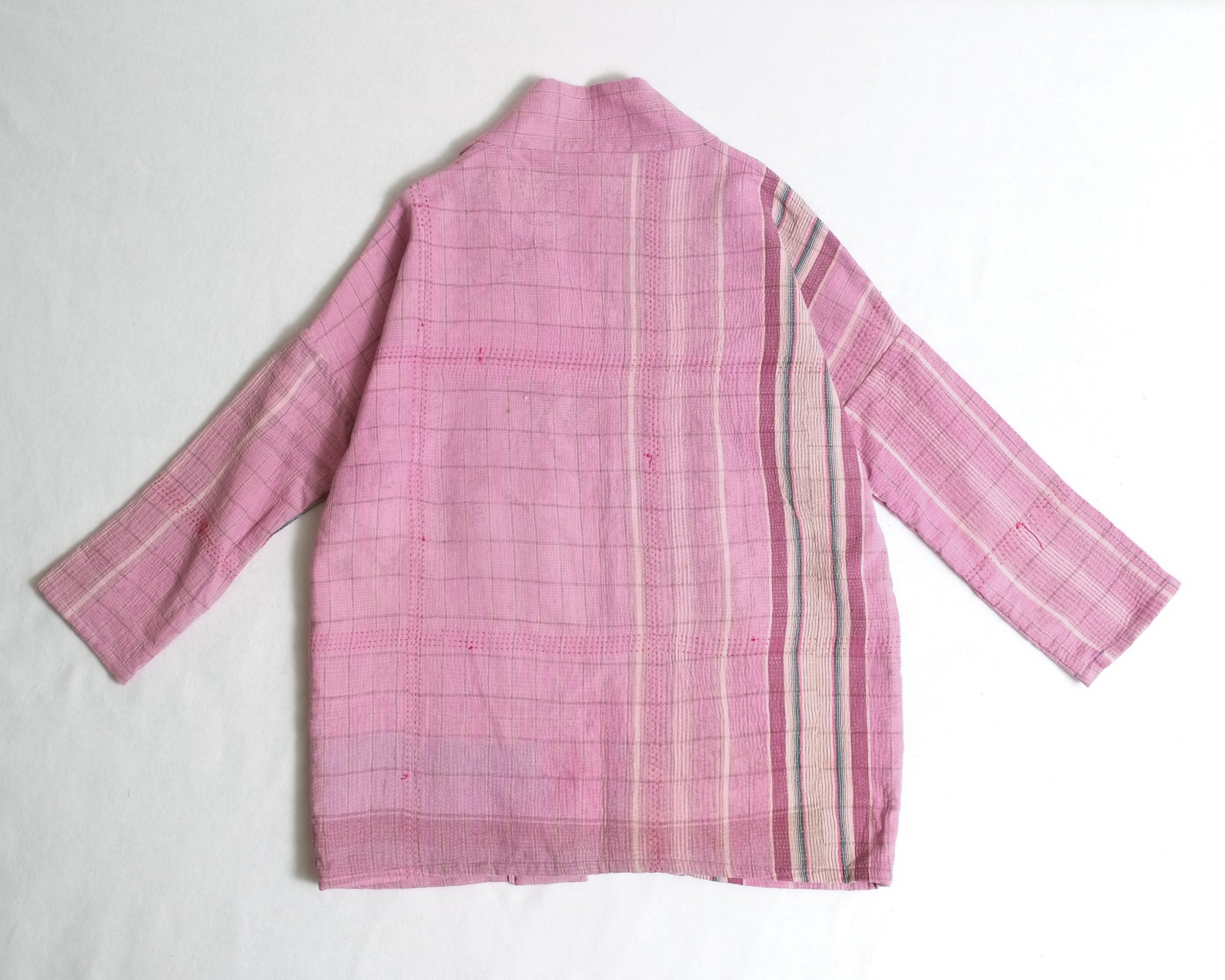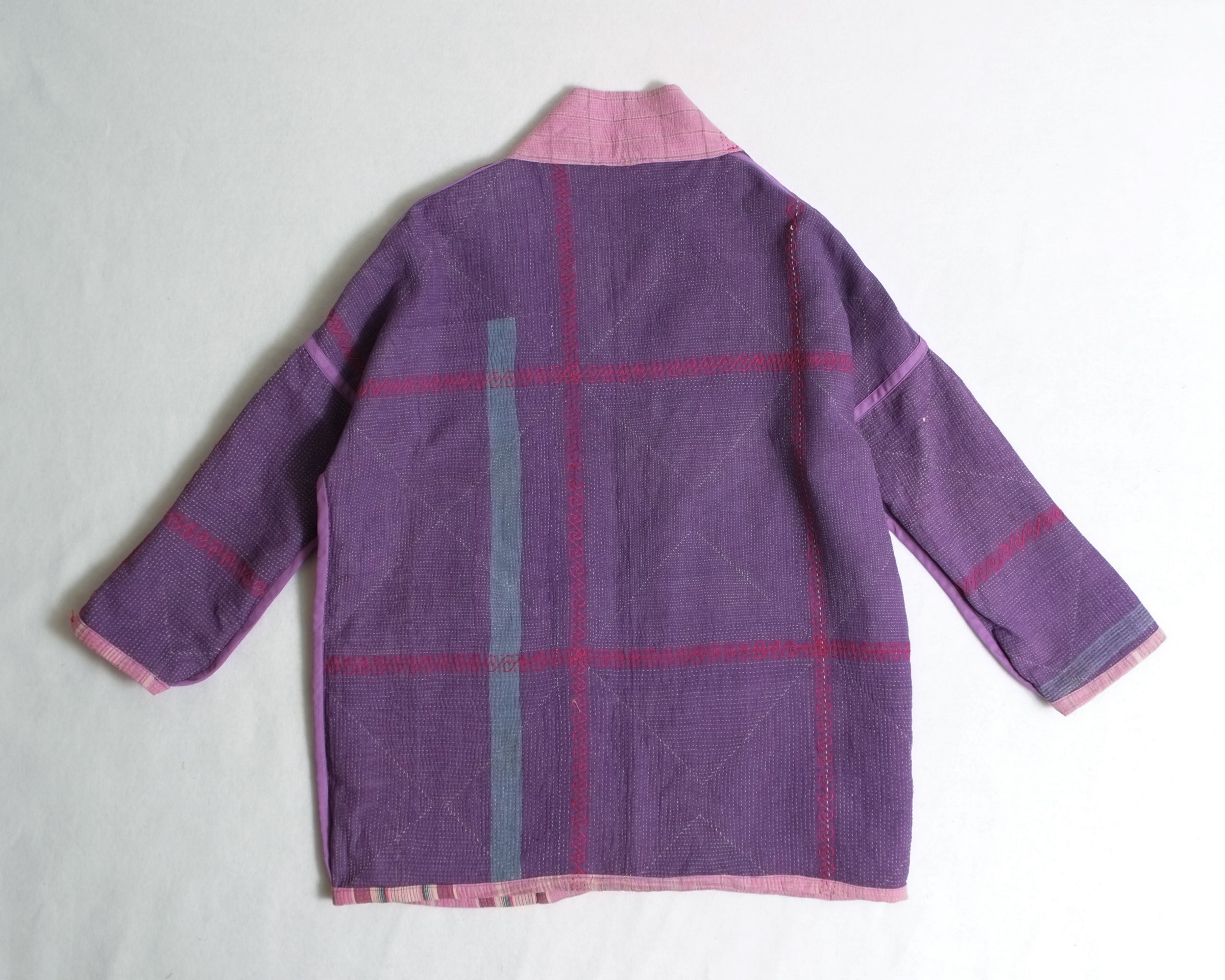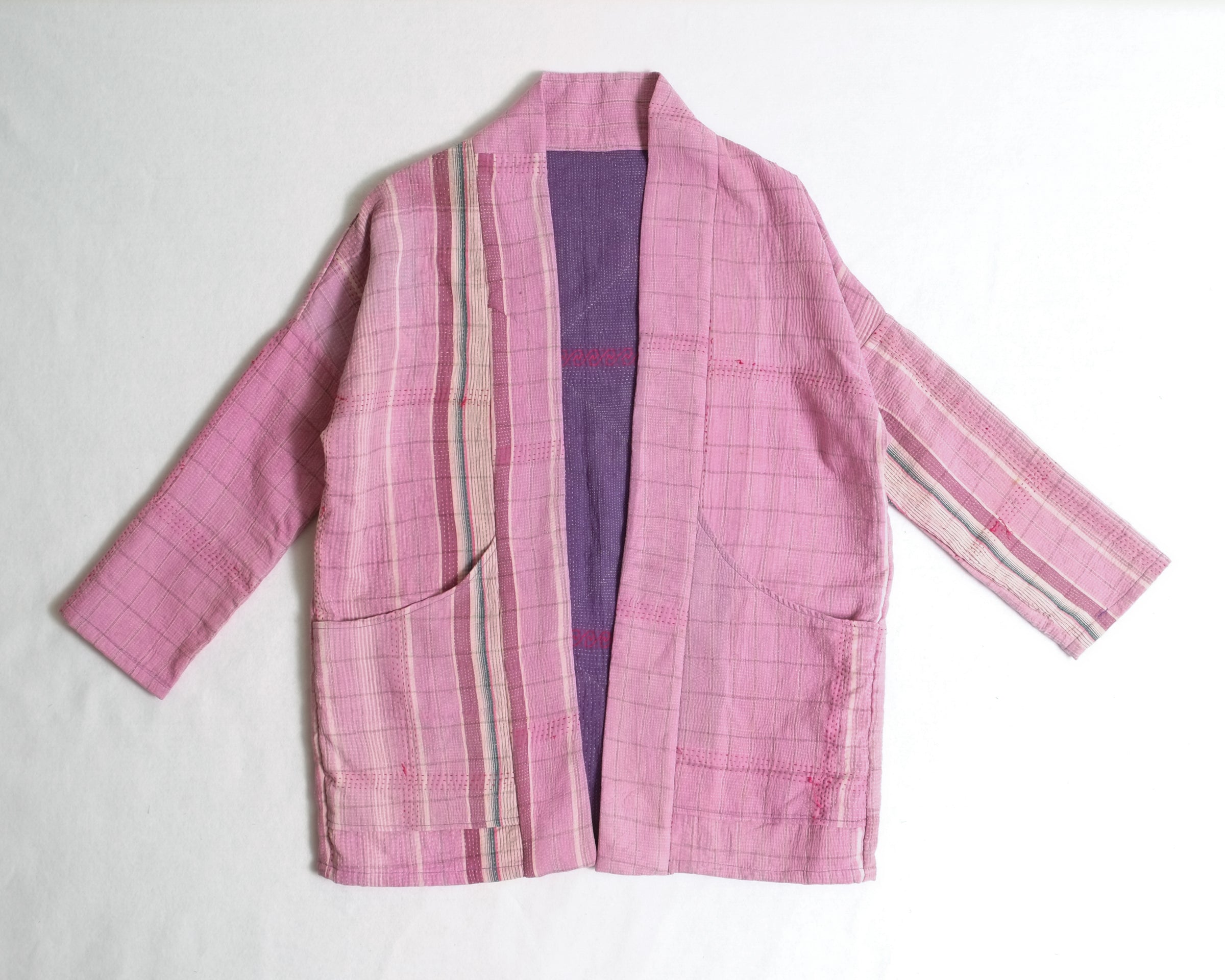 Made from traditional Bengali Kantha quilts, repurposed from vintage saris and fabrics, each Anoushka Jacket is a unique, reversible creation designed for comfort and style. The oversized kimono silhouette, inspired by Asian street style, features large pockets for essentials like your phone, wallet, or snacks.