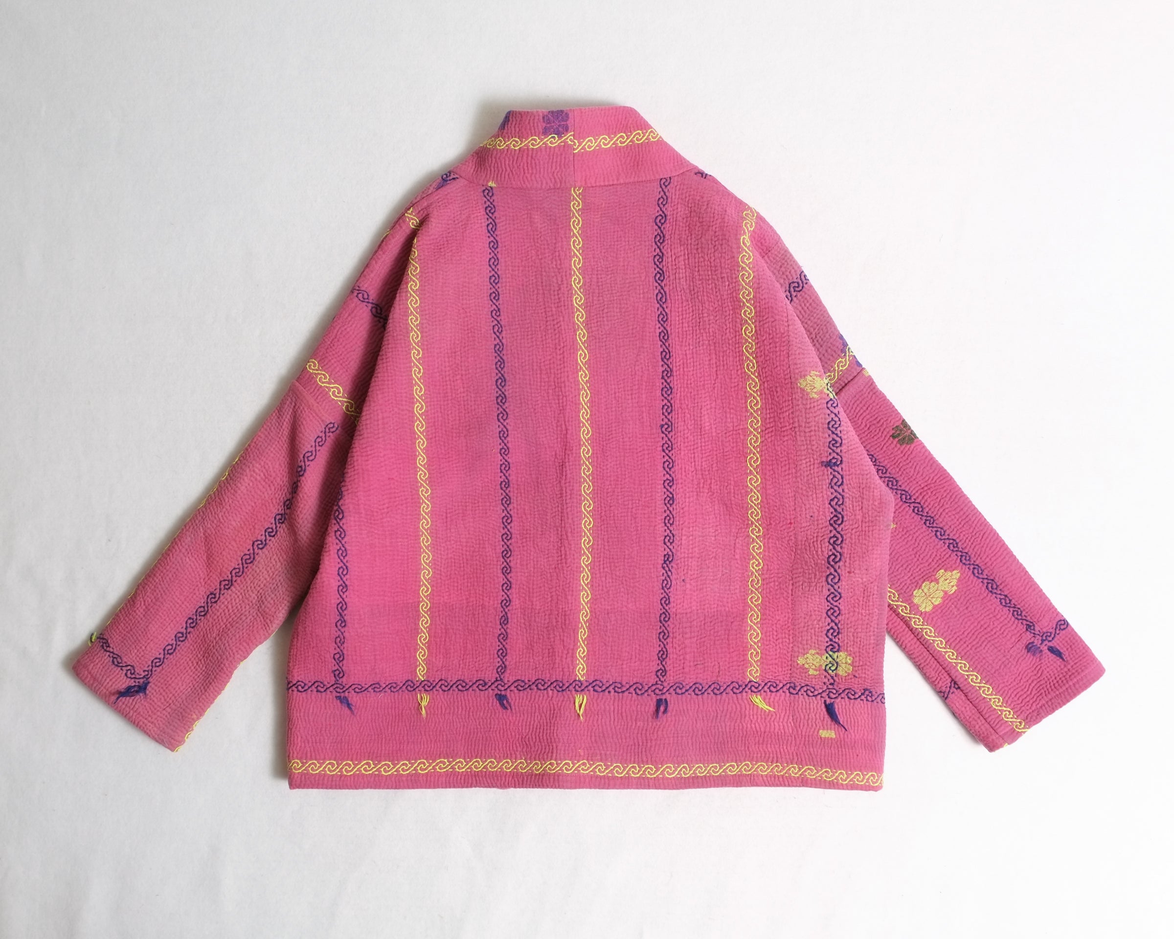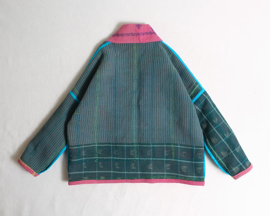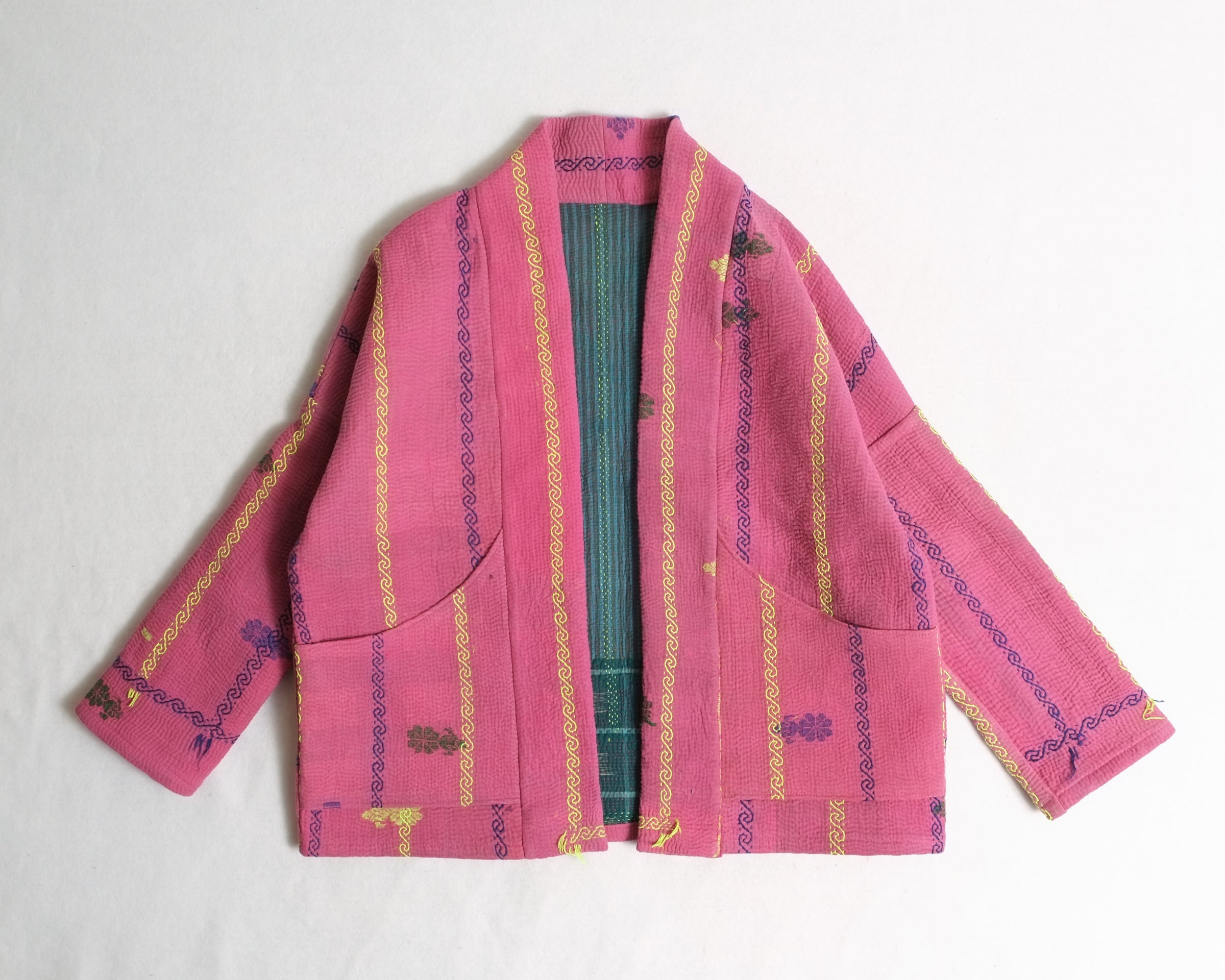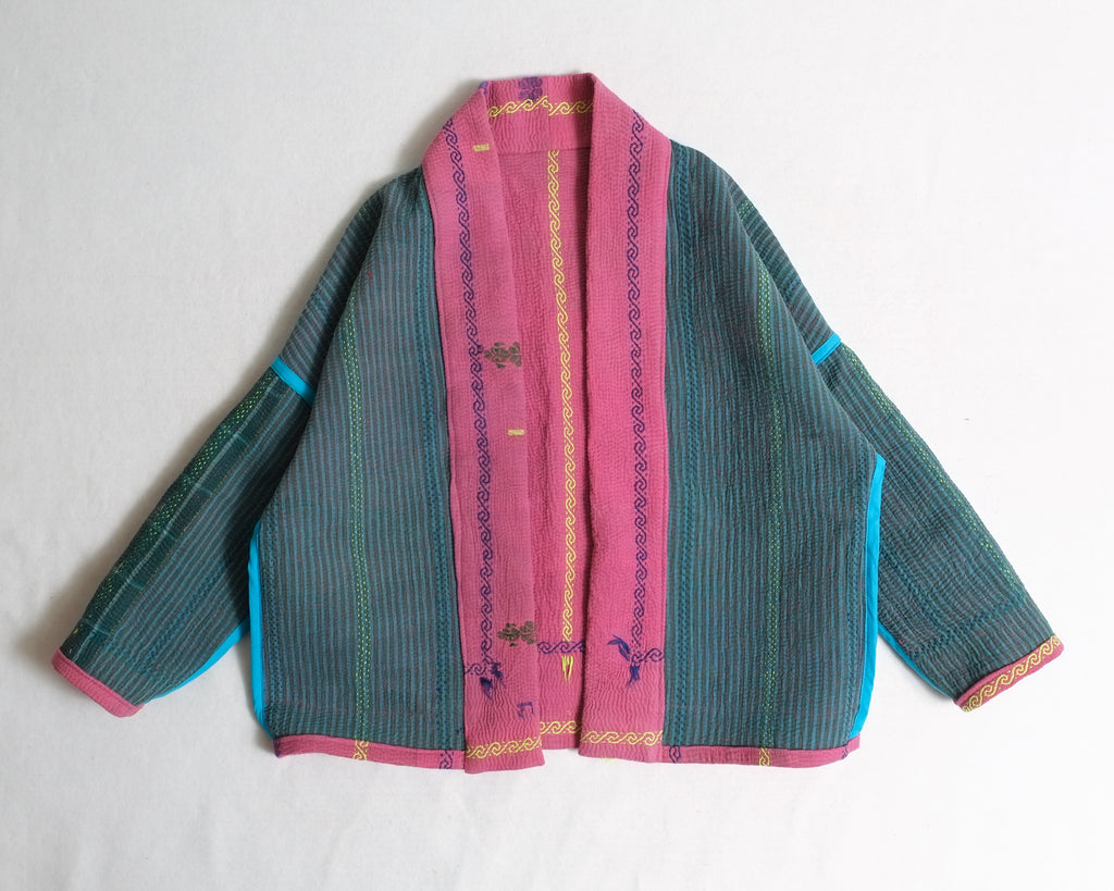 Made from traditional Bengali Kantha quilts, repurposed from vintage saris and fabrics, each Anoushka Jacket is a unique, reversible creation designed for comfort and style. The oversized kimono silhouette, inspired by Asian street style, features large pockets for essentials like your phone, wallet, or snacks.