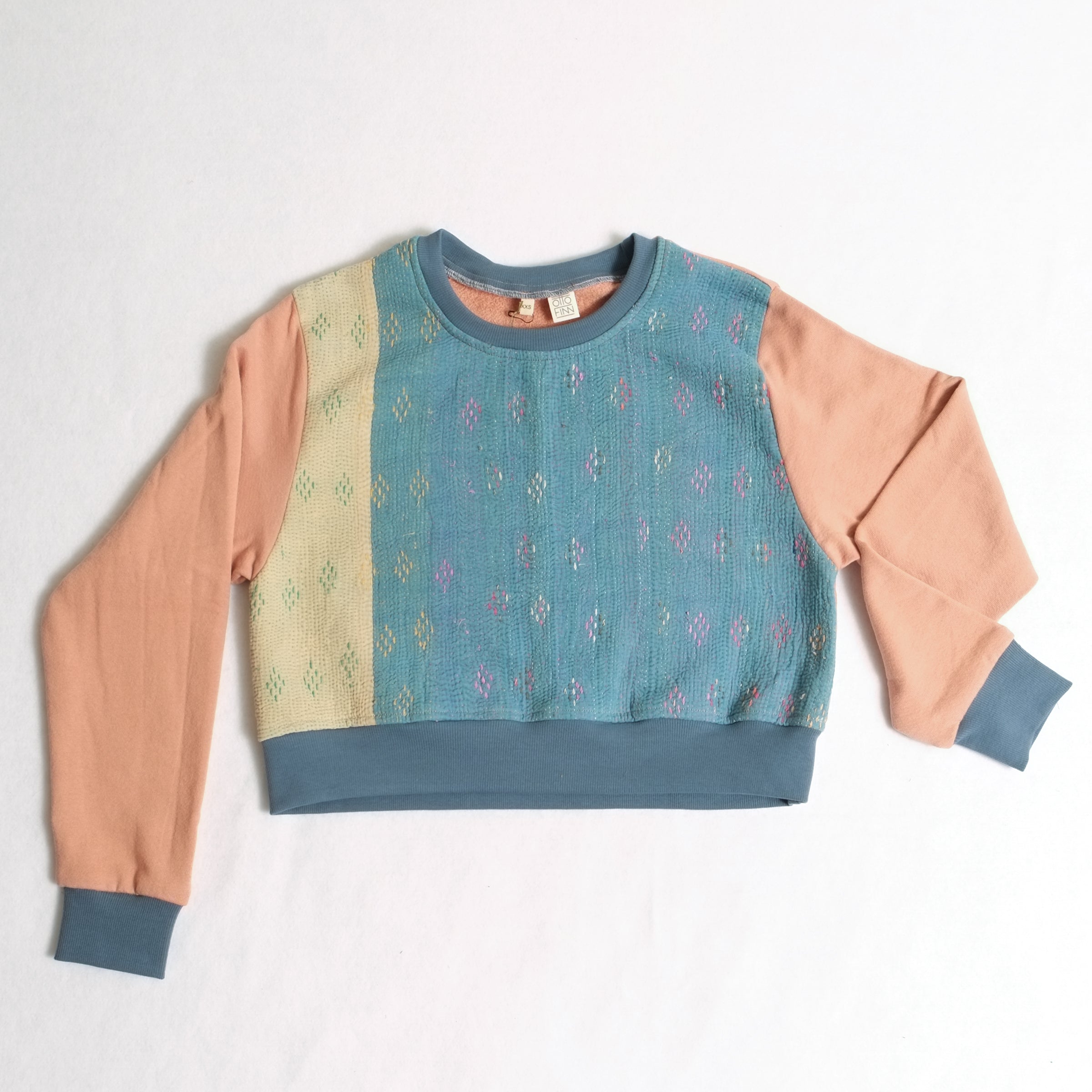The Francesca Cropped Sweatshirt is a celebration and embracing of the body, color, and comfort. It features our beautiful vintage kantha on the front and a super soft, luxurious 100% organic cotton French Terry on the back and sleeves. We use an organic cotton contrasting rib on the cuffs and neck band to play up the colors in the kantha. It's named after American photographer Francesca Woodman whose work was full of self-exploration and experimentation.