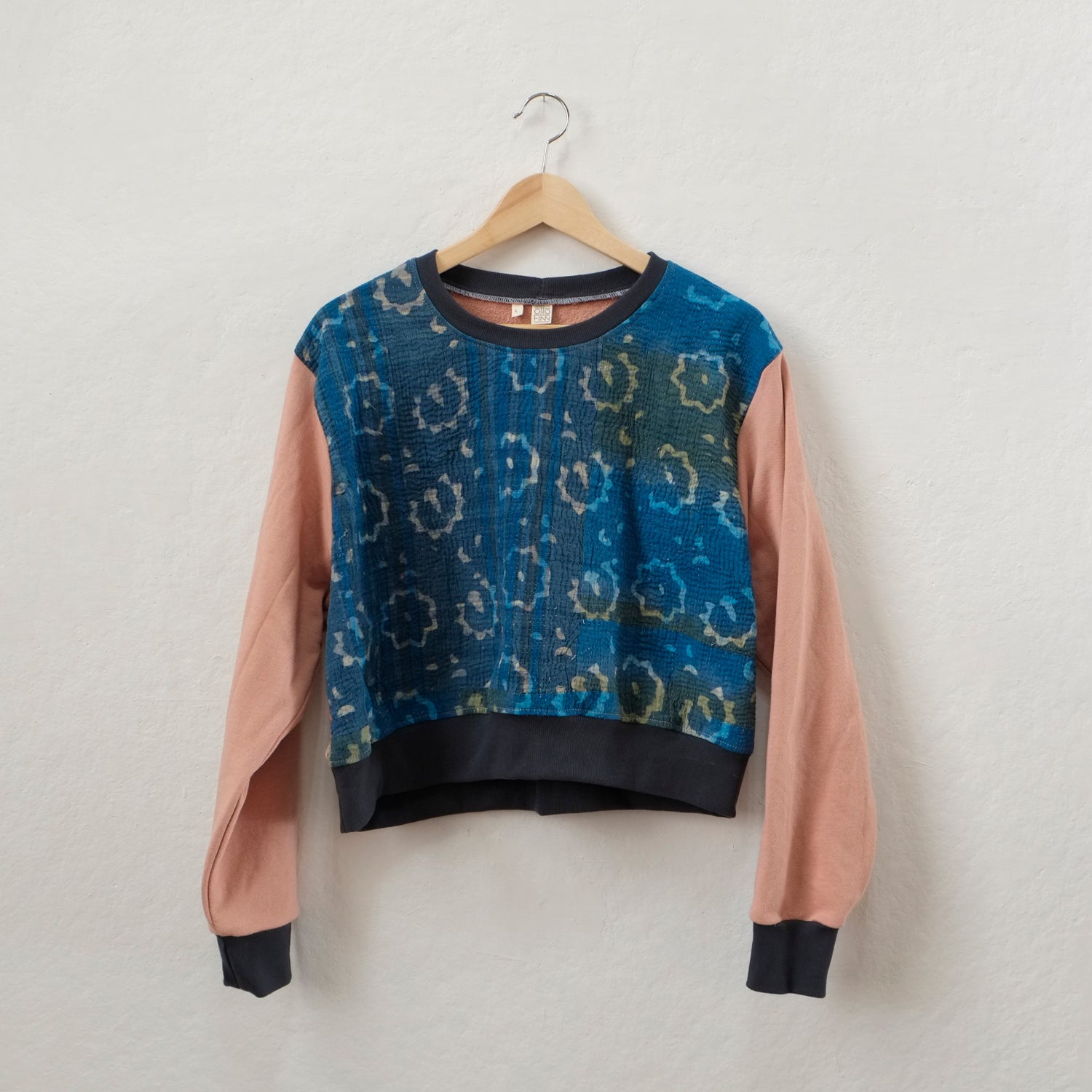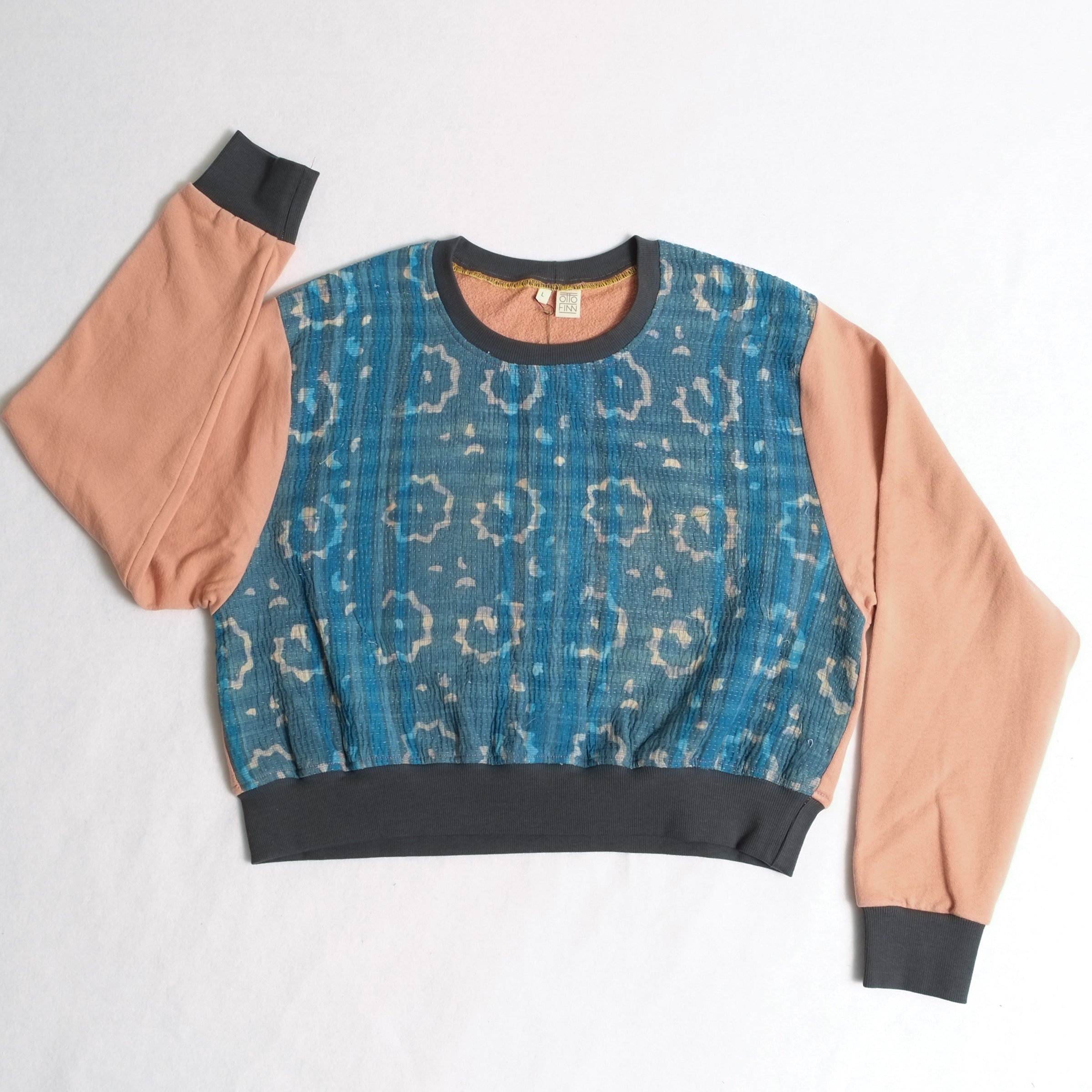The Francesca Cropped Sweatshirt is a celebration and embracing of the body, color, and comfort. It features our beautiful vintage kantha on the front and a super soft, luxurious 100% organic cotton French Terry on the back and sleeves. We use an organic cotton contrasting rib on the cuffs and neck band to play up the colors in the kantha. It's named after American photographer Francesca Woodman whose work was full of self-exploration and experimentation.