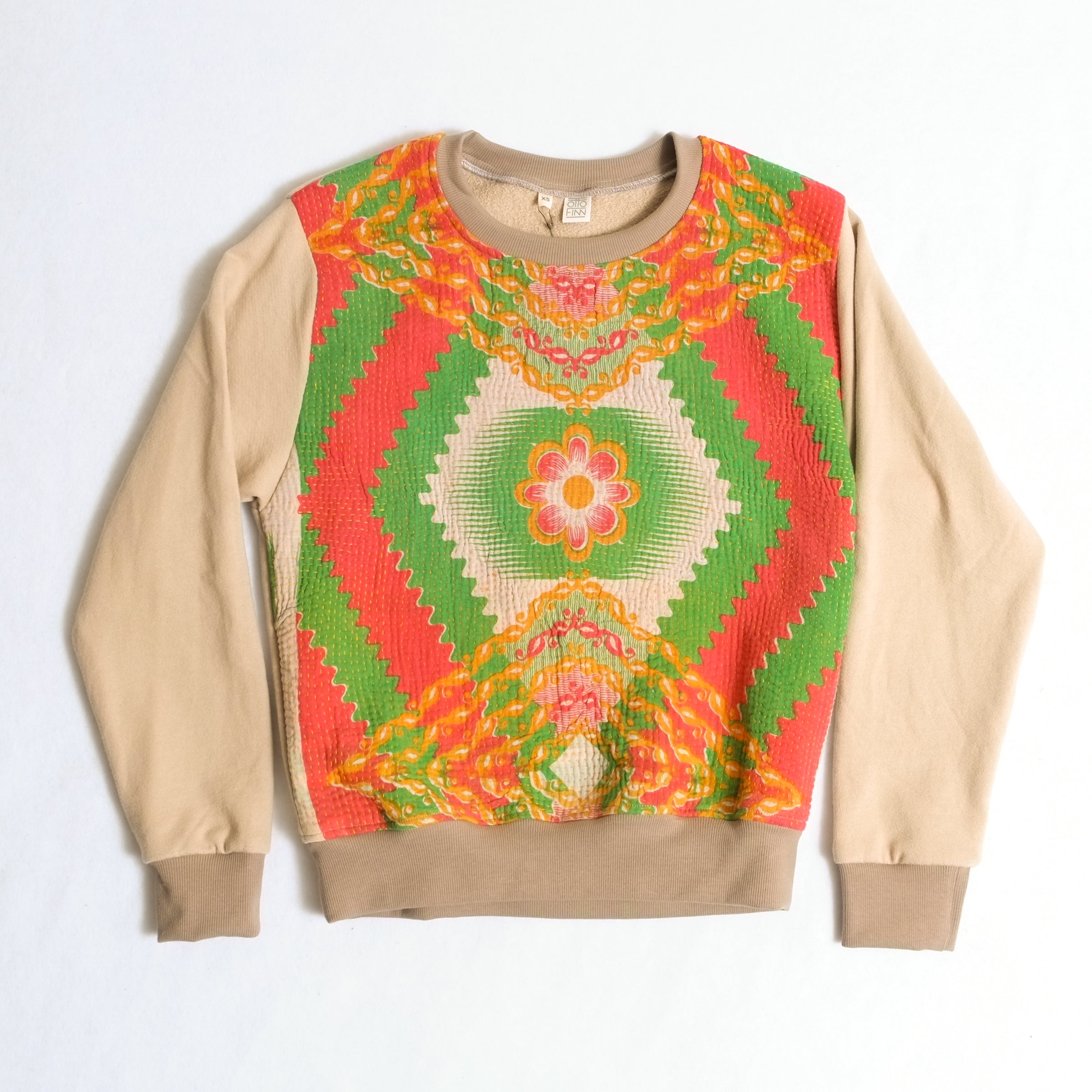 The Pauli Sweatshirt is a gender neutral, full length sweatshirt made with a vintage kantha front and organic cotton french terry sleeves and back.